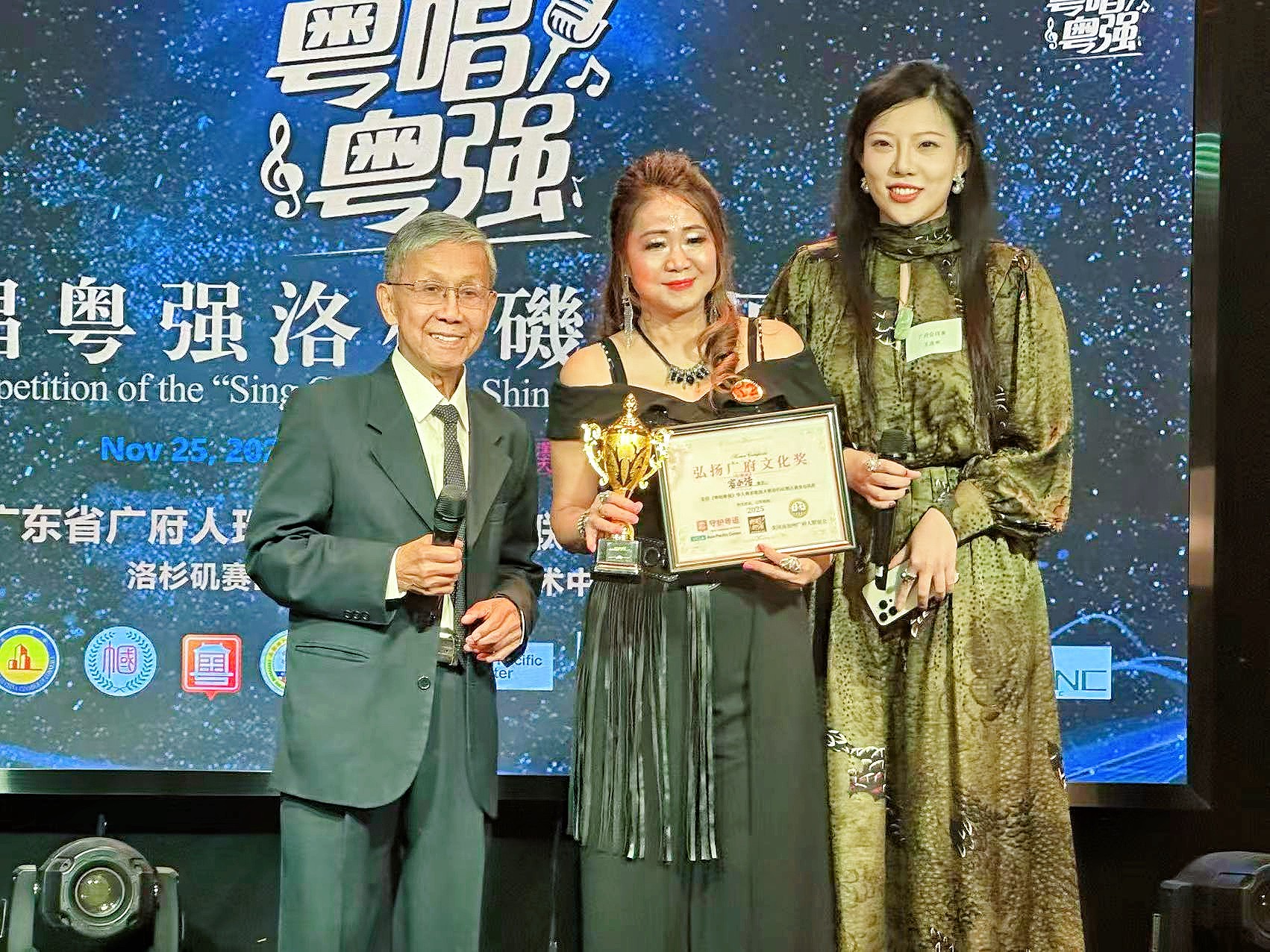 After several competitive rounds, 15 talented finalists took the stage, impressing the judges with their skill and emotion. Chair Member Xue Hanwen and Youth Committee President Wendy Wang 王温蒂 of the Cantonese Society of Southern California presented the Best Stage Presence Award to Rong Xiaojie, while Ma Shurong, Honorary President of the Guangdong Guangfu Zhuji Lane Descendants Overseas Friendship Association, awarded the Champion Title to Liu Chong, who will represent Los Angeles at the Global Finals in Guangzhou.